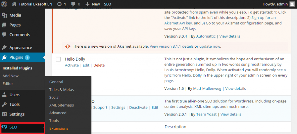 Trên hình ảnh gồm 2 tab là Extensions và Licenses- Extensions: Bạn có thể chọn một số ứng dụng hỗ trợ giúp cho trang của bạn SEO dễ dàng như: WorPress SEO Premium, Video SEO, New SEO, Local SEO