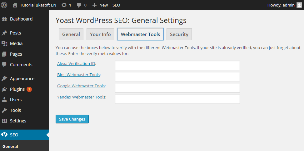 Đây là bảng cài đặt chính cho plugin WordPress SEO, trong menu sẽ bao gồm những thông tin chung về quyền sử dụng chức năng SEO, tùy chọn cho phép tác giả thu thập thông tin quá trình hoạt động của plugin, các mục cho phép bạn nhập mã xác thực của những công cụ hữu ích. Trong những mục này, chỉ có phần Security là quan trọng nhất.