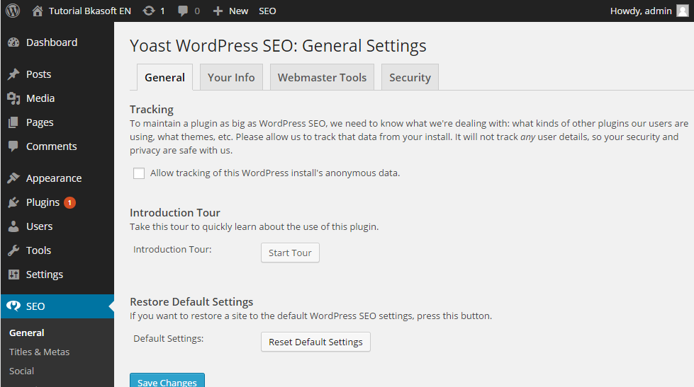 - Tracking (hay còn gọi là theo dõi): Để duy trì một plugin lớn như WordPress SEO, bạn cũng cần phải biết những gì tác giả đang làm việc như loại plugin khác mà người dùng đang sử dụng, những chủ đề,… Tác giả mong muốn theo dõi các dữ liệu từ các cài đặt của các bạn nhưng không bao gồm chi tiết người dùng, vậy nên an ninh và riêng tư của bạn luôn được an toàn. Bạn có thể tích vào ô “Allow tracking of this WordPress install’s anonymous data” hoặc không.