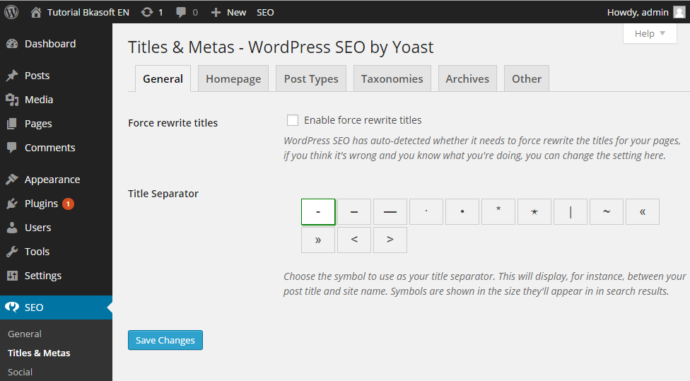 Hình ảnh dưới đây ta có thể thấy có 2 mục là Force rewrite titles và Title Separator
