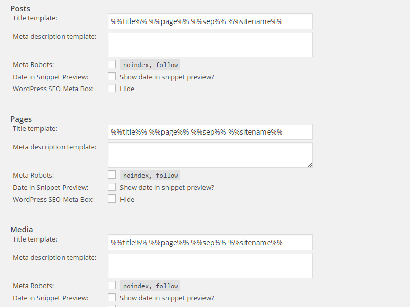 - Đối với các ô checkbox của Posts và Pages thì bạn hãy để trống, riêng phần Media thì bạn chọn vào ô Meta Robots để cho các công cụ tìm kiếm không index các trang hình ảnh vì nó không có ích cho lắm.
